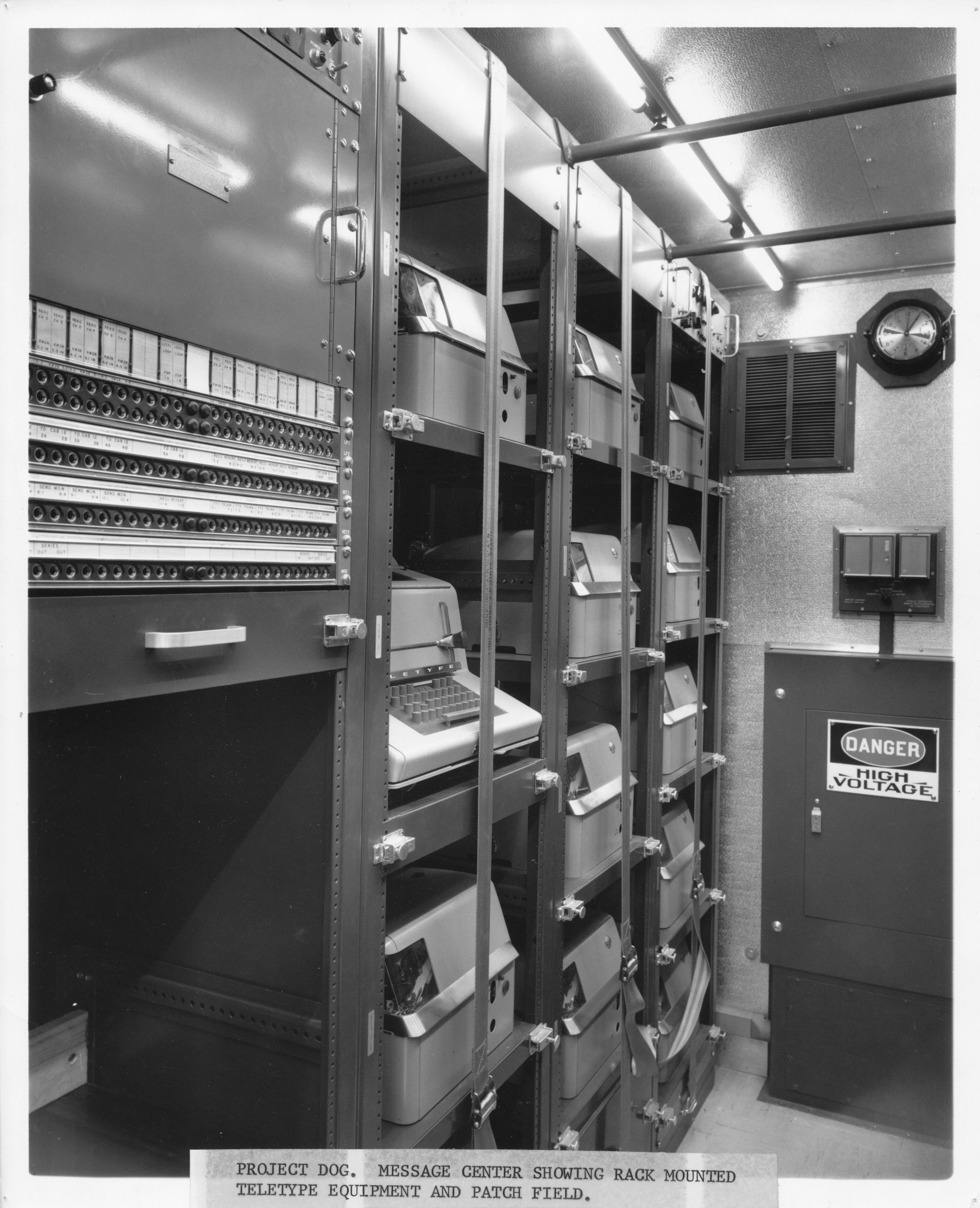 Message Center showing mounted teletype equipment and patch field.