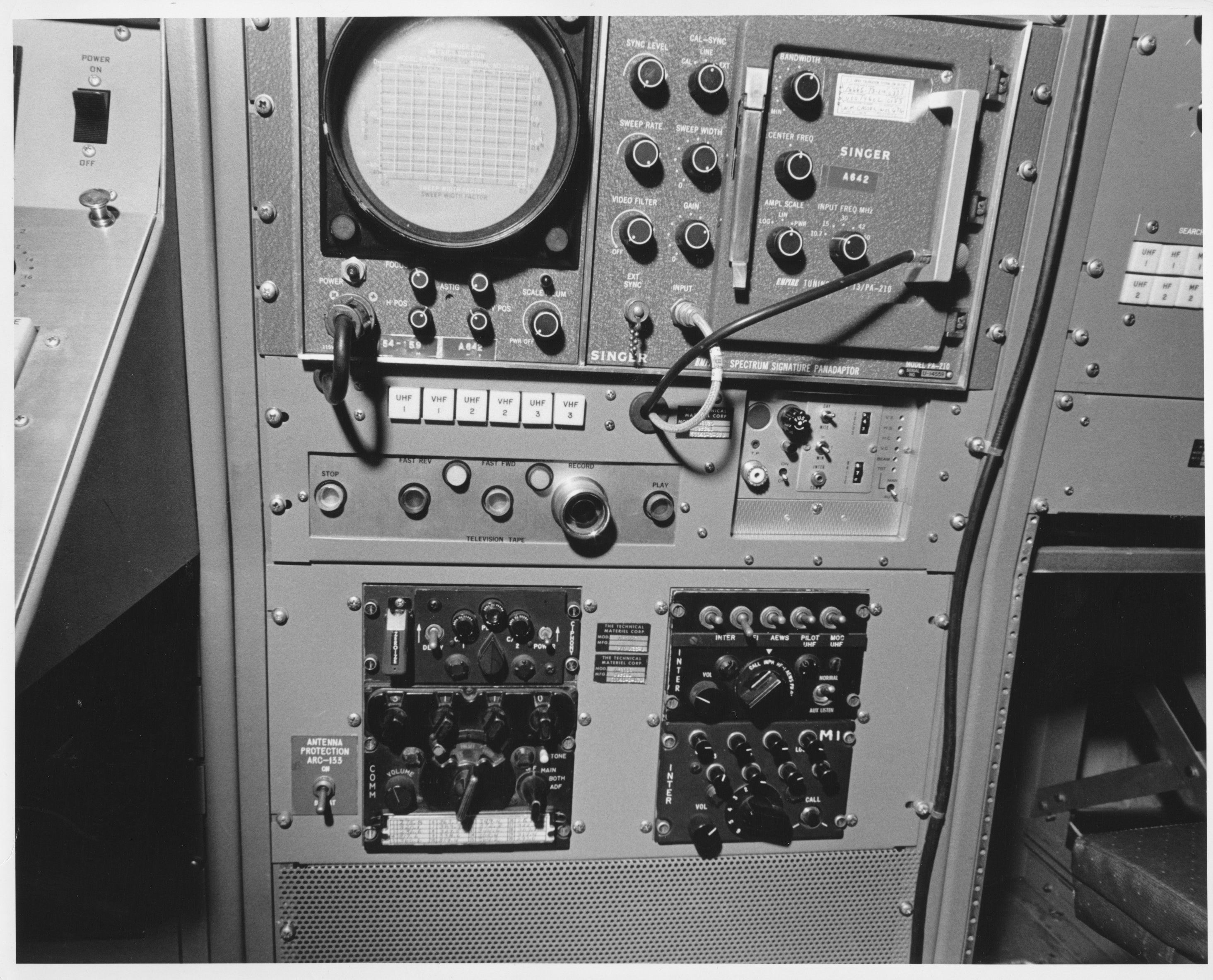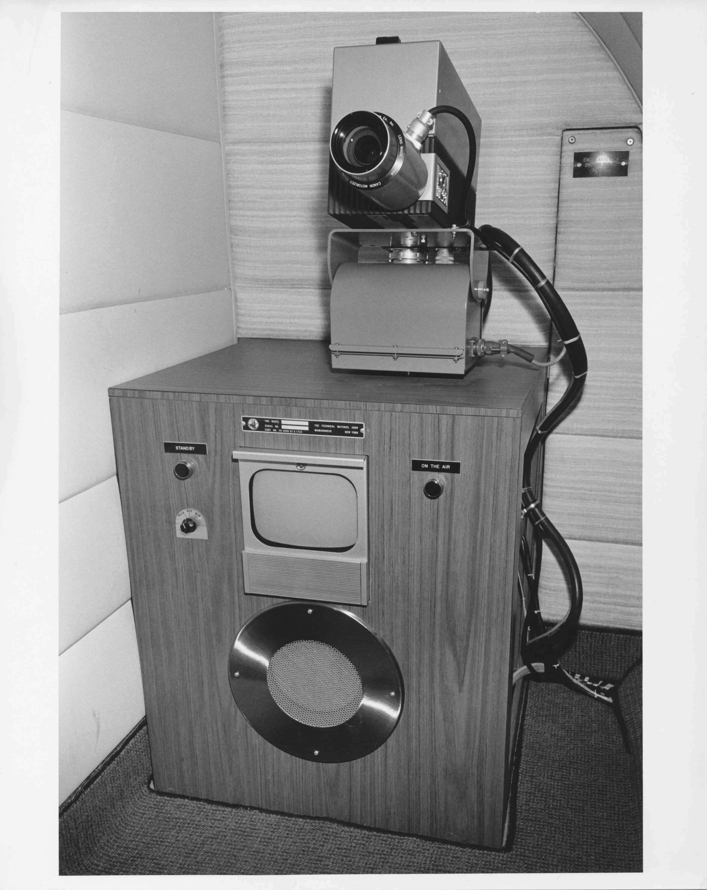 C706.4-A18.  View of camera chain from rear(?) of aircraft. C706.4-A10.  Sync switch bottom C706.4-A11.  Sync switch overall. C706.4-B25.  TV camera and console.  This unit was used in conjunction with the seats and control consoles shown in photo C706.4-B23, forming the airborne TV studio.  The camera could be controlled from the console, and the outgoing image could be viewed on the monitor.