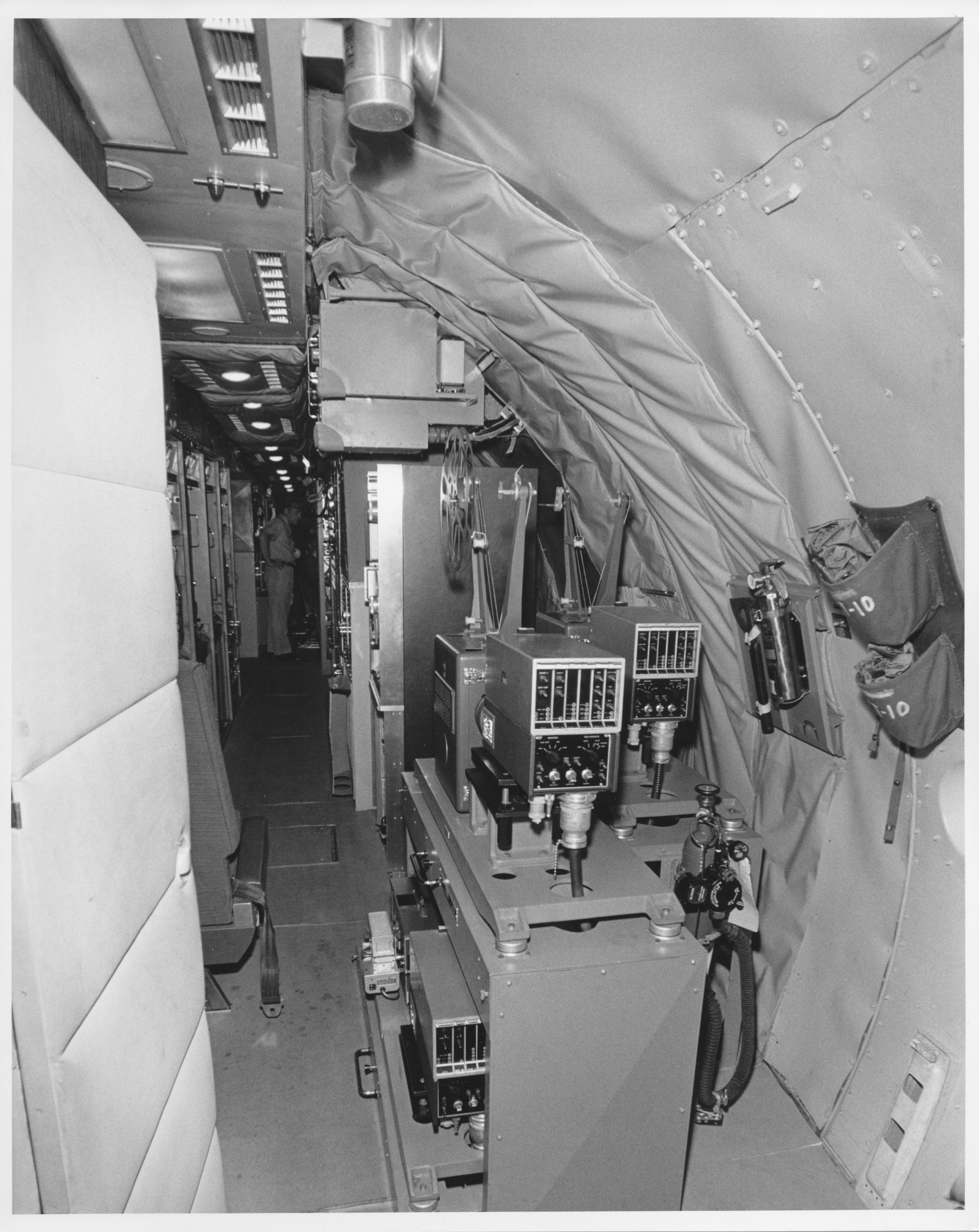 No number, but units 13.  Photo has written on back: "Both reel & cartridge tape recorders and all radio receiver information is processed here for presentation to central control console.  Companders  provide high quality processing of audio information." No number, but clearly unit 17.   Photo has written on back:  "Command control console.  Right rack provides complete control of all transmitted information as well as monitor of all receive channels.  Spectrum analyzers & video picture monitors provide visual presentation." 681.15-9  Aircraft model.  Sadly, resolution is not quite high enough to read the diagram on the wall!!  The aircraft is pretty clearly Blue Eagle I, but the equipment shown is fairly different from the photo to the right.  Any help on figuring out the differences would be gratefully accepted! This photo appears to show Blue Eagle I, configured quite differently from the plane shown to the left.  From discussions with John Showalter, I believe this was the initial configuration of BE-I, with a TMC diesel generator, a GPT-10K, a GPT-10KLF, a sound-proofed studio (just aft the cockpit), the trailing wire antenna system, the dipole antenna coupler (aft), and a bunch of HF comm's gear, which Dixon, a ham, evidently used quite a bit during test flights!