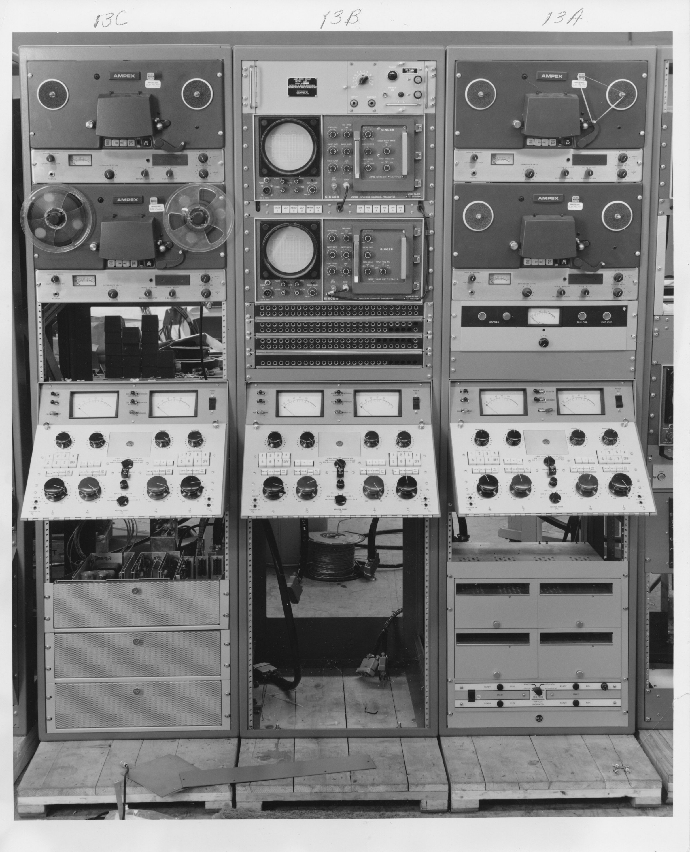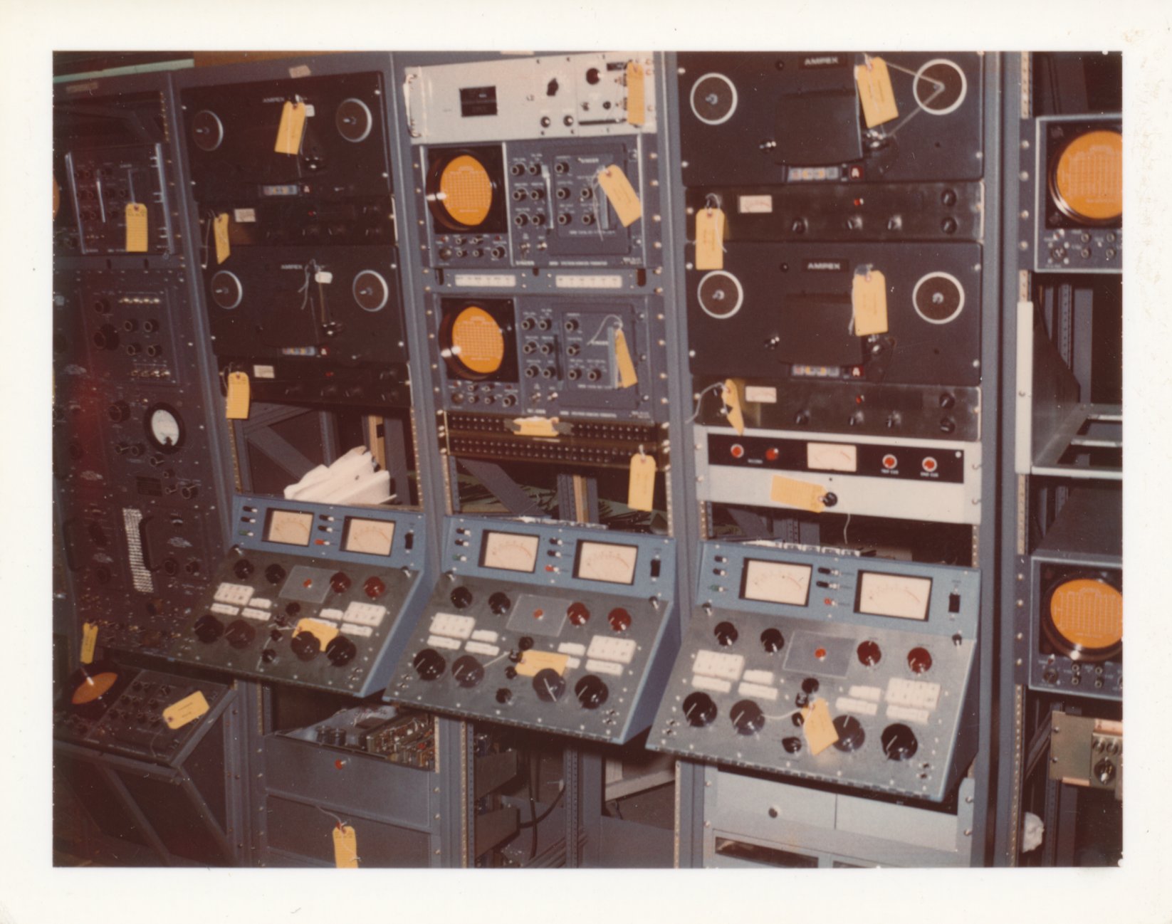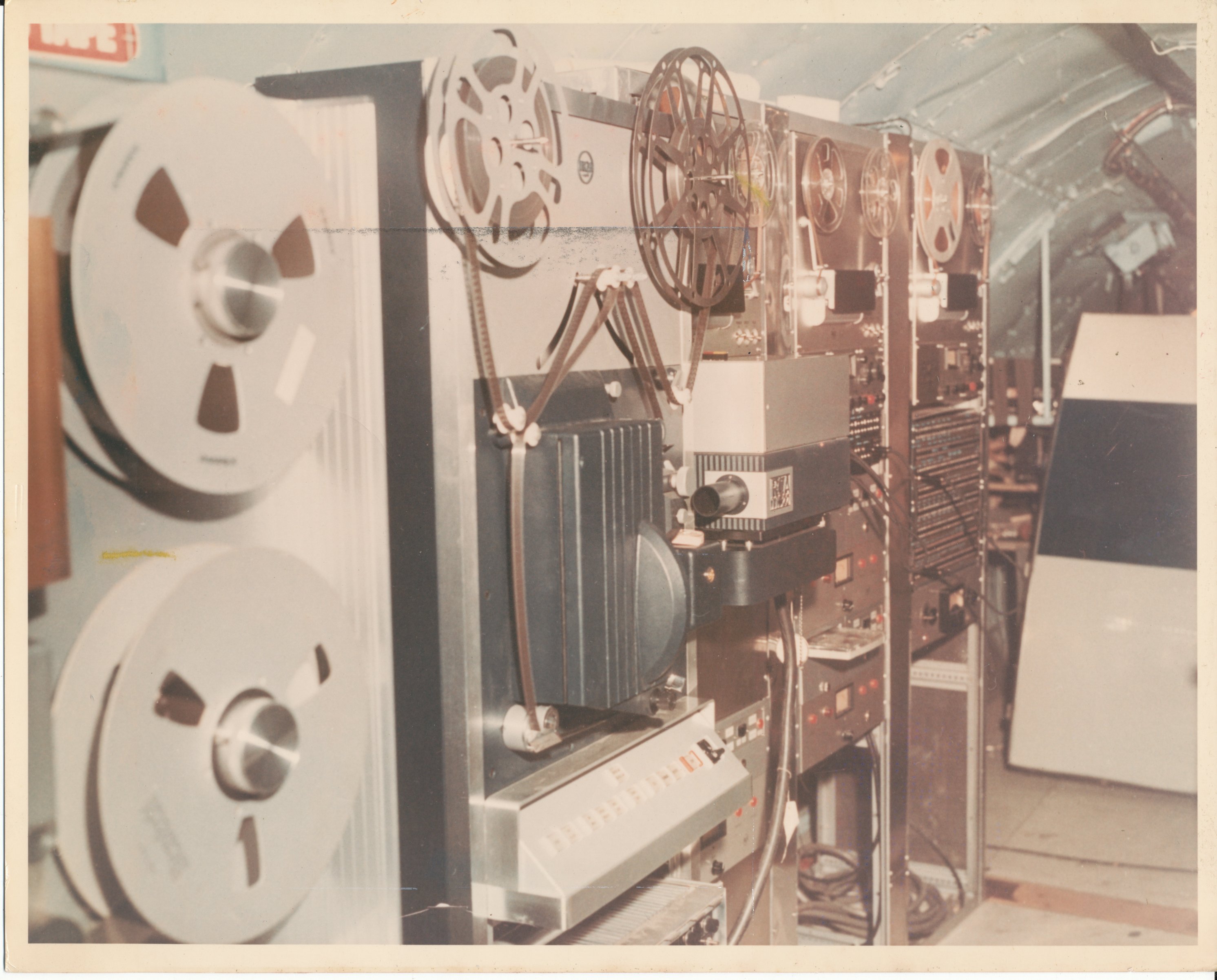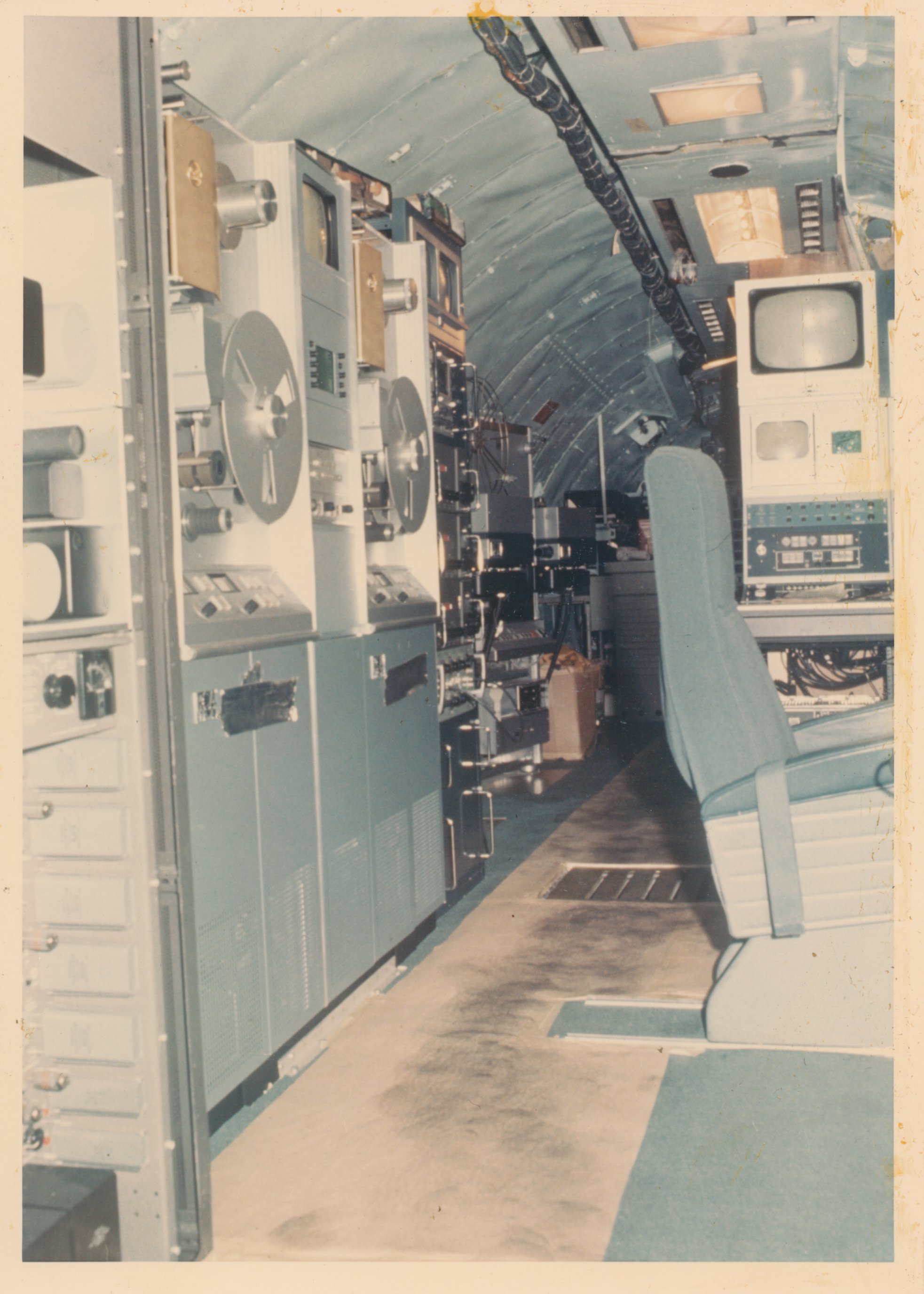These two photos show Units 13A,B,C with audio tapes installed.  One view is aft, one for'ard, but I'm not sure which. This interior photo shows a pair of huge video tape players.  This photo shows a couple of film-to-video systems.  These units are just barely visible behind the VTR's in the photo to the left.