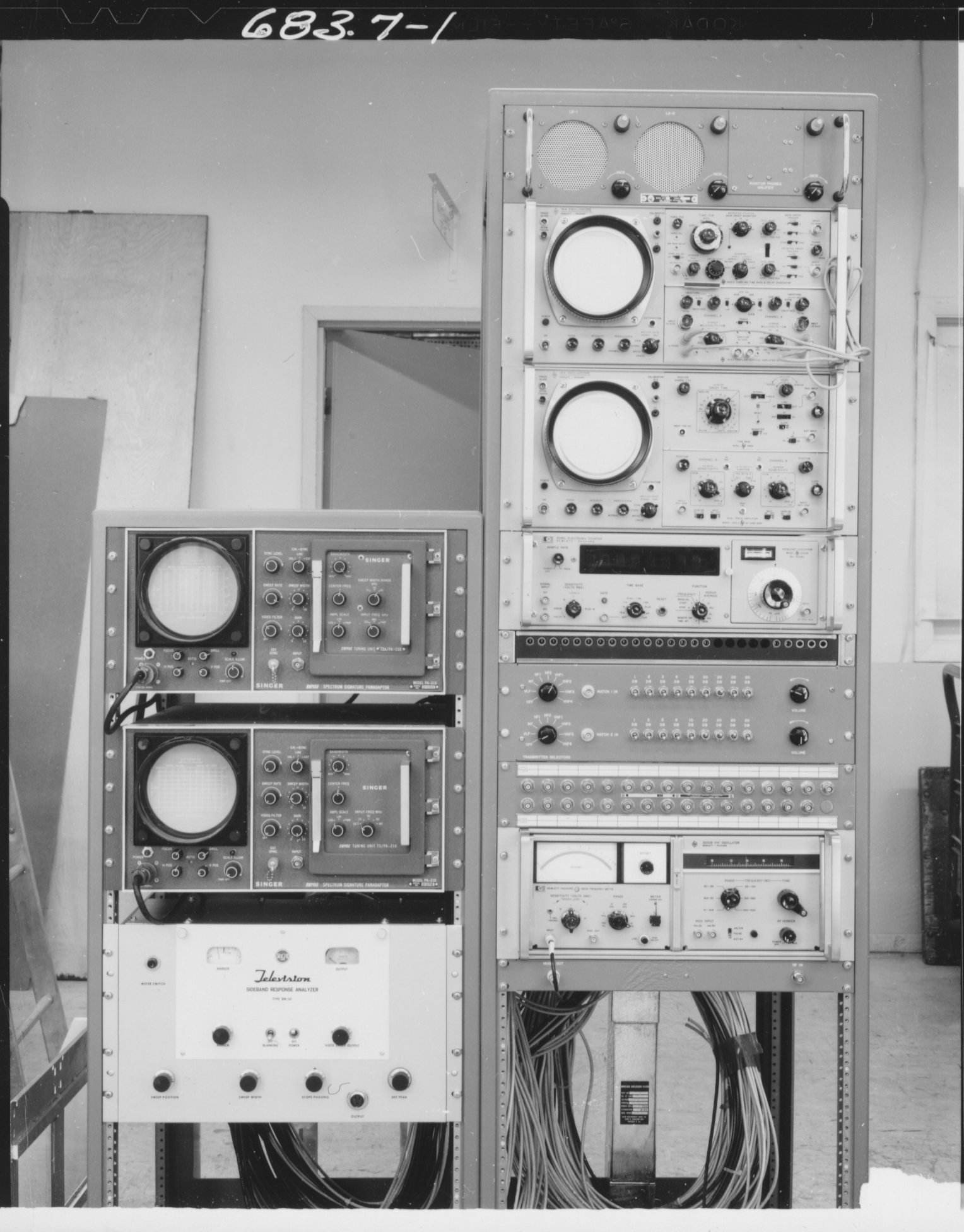 6811.5-1 TMC SPT-3KVHF Transmitter.  This unit provided CW, AM, FM, and television transmission between 30 and 350 Mc.  Evidently, it could provide 4 simultaneous 2KW outputs in pairs on two bands.  This transmitter was designed and built by Multronics, Inc, under contract to TMC. No photo number, but clearly the SPT-3KVHF shown  in 6811.5-1 while under construction. 6811.5-2.  Overall view of SPT-3KVHF transmitter. 687.5-5  View behind one of the two switching panels of the SPB-3KVHF.