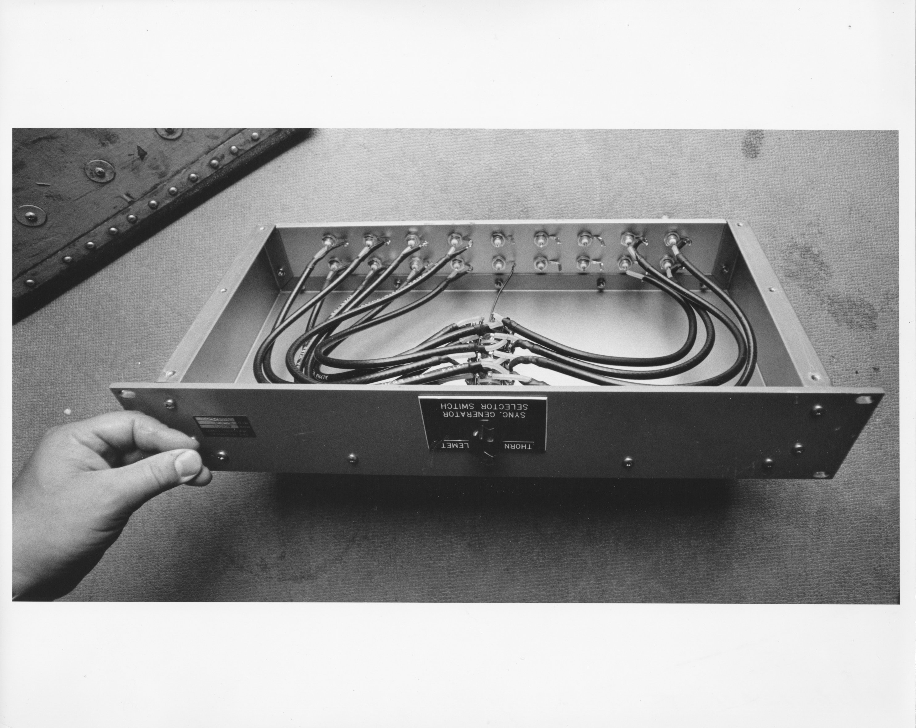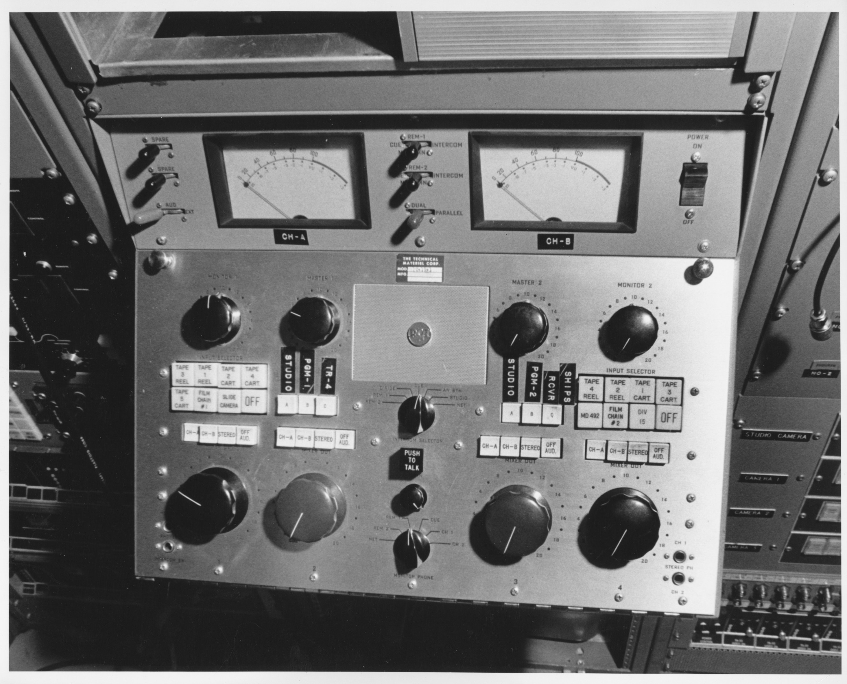 C706.4-A18.  View of camera chain from rear(?) of aircraft. C706.4-A10.  Sync switch bottom C706.4-A11.  Sync switch overall. C706.4-B25.  TV camera and console.  This unit was used in conjunction with the seats and control consoles shown in photo C706.4-B23, forming the airborne TV studio.  The camera could be controlled from the console, and the outgoing image could be viewed on the monitor.
