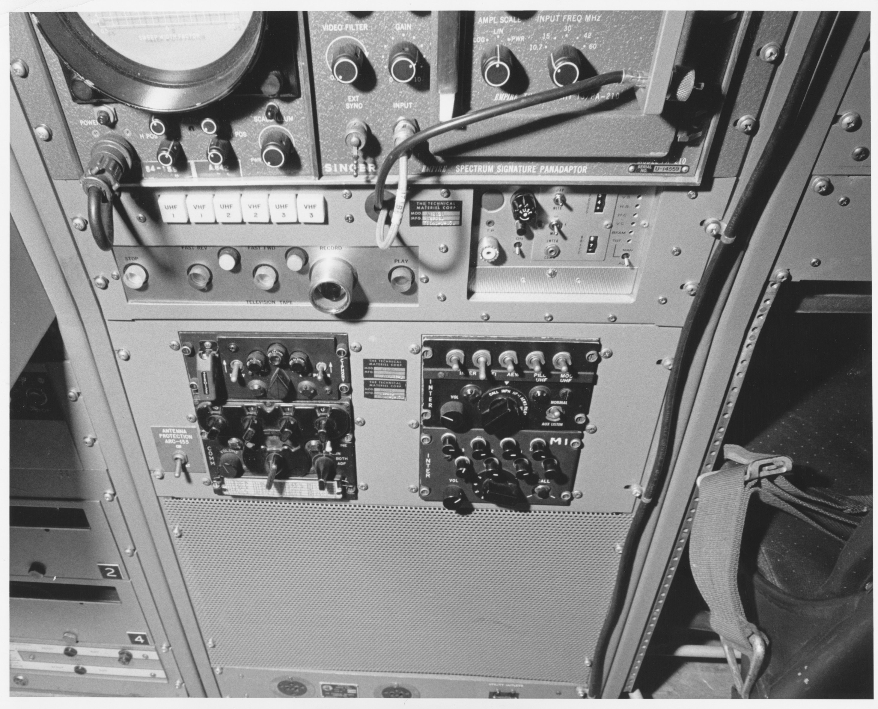 Blue Eagle II and III (BUNO's 131611 and 131429) were later assigned to the development effort to test various TV antenna configurations.  I believe the photo immediately below may be one of these aircraft, though the antennas shown in the photo were not those that eventually were deployed in service.  These later aircraft appear to have had some TMC equipment, including a TMC GPT-10K HF broadcast transmitter and HF communications gear.  The television equipment was probably built by RCA, but evidence (the photos below from the TMC photo archive) suggests that the equipment racks containing communications and TV monitoring gear were probably integrated and cabled at TMC in Mamaroneck.