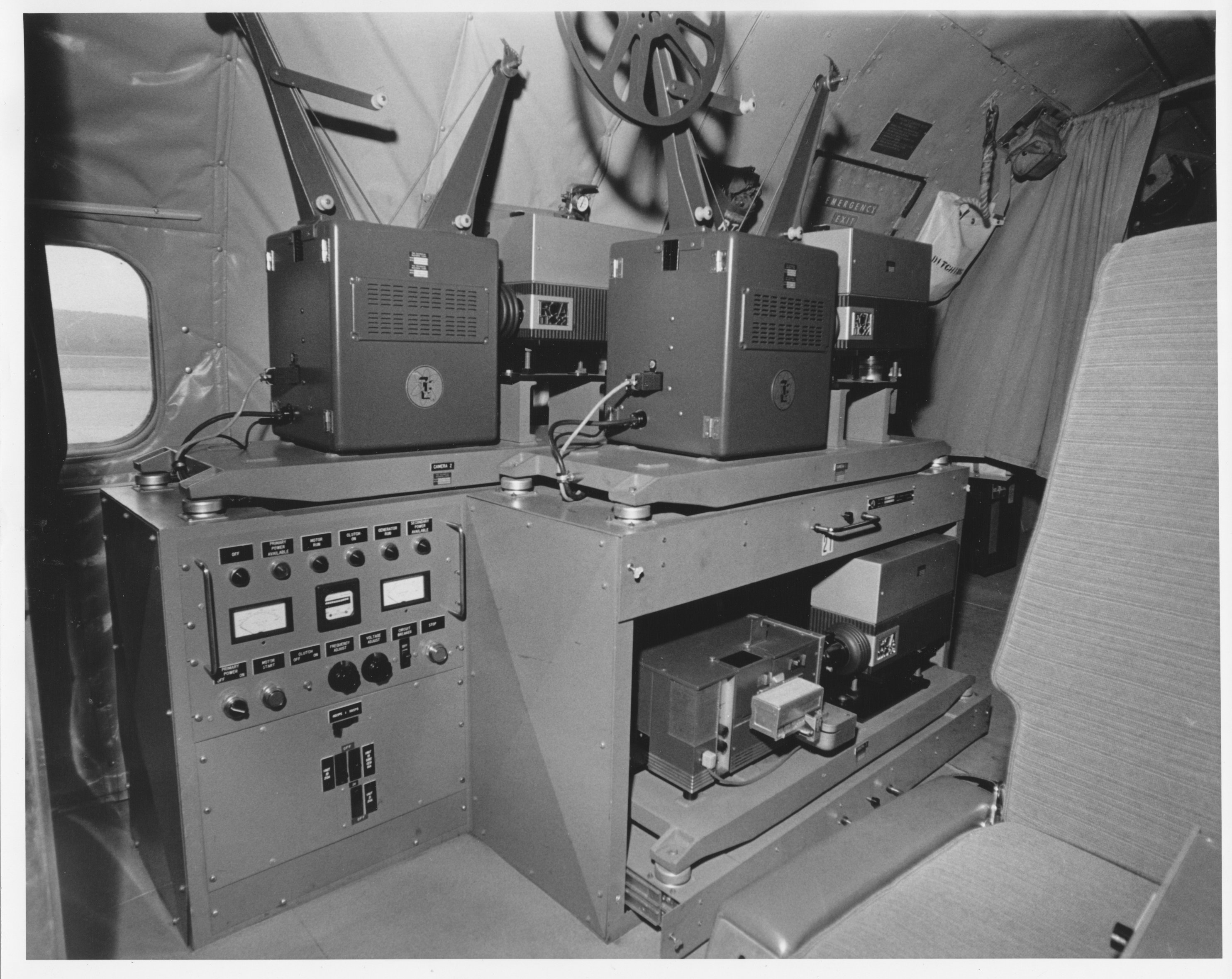 686.5-6 Kinescope equipment, also referred to as "camera chain"  Bottom camer is attached to a slide projector. No photo number, but both of these photos in folder titled "Camera Chain" 686.5-2  TV camera, not clear what purpose.. see below in aircraft interior photos