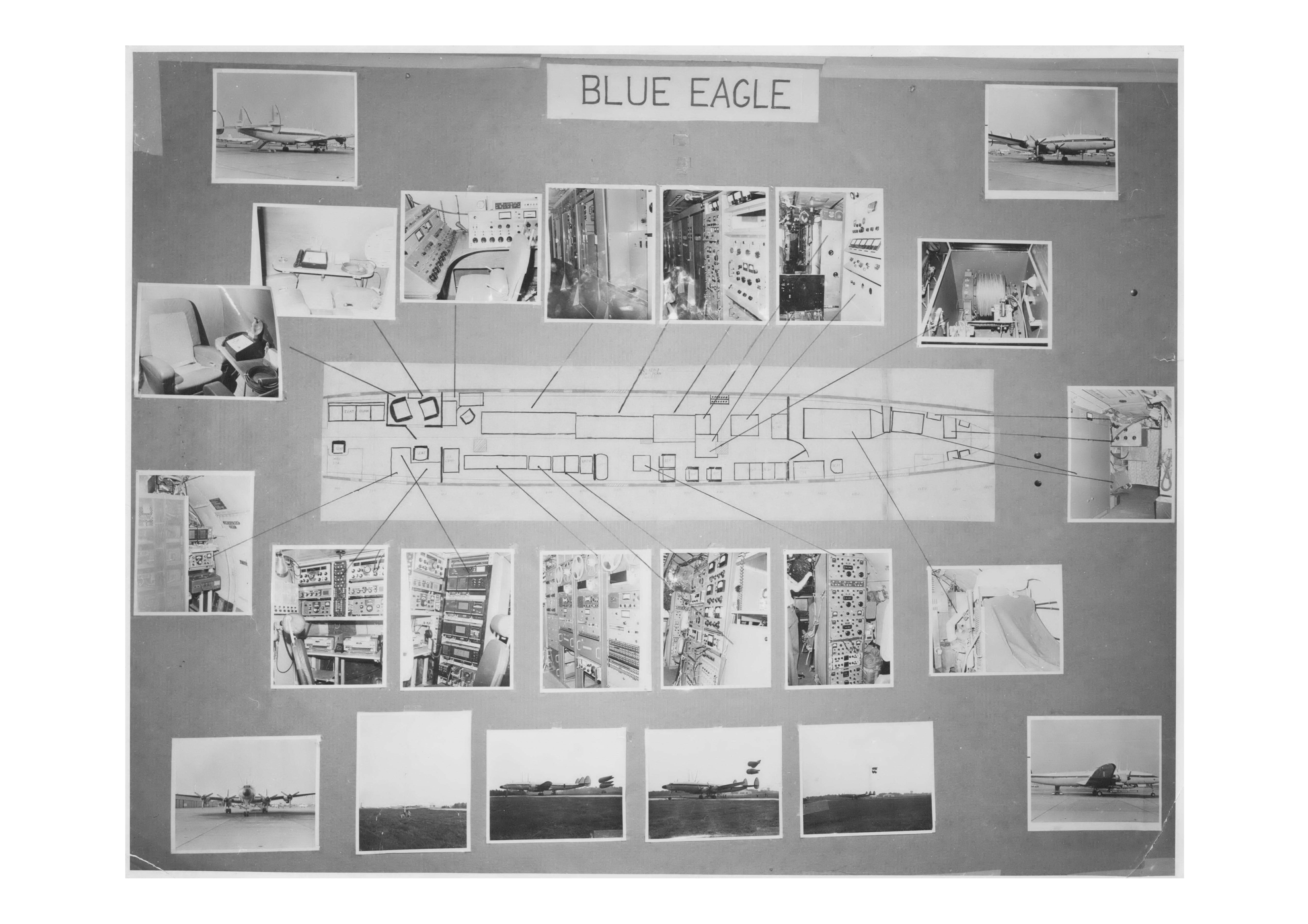 No number, but units 13.  Photo has written on back: "Both reel & cartridge tape recorders and all radio receiver information is processed here for presentation to central control console.  Companders  provide high quality processing of audio information." No number, but clearly unit 17.   Photo has written on back:  "Command control console.  Right rack provides complete control of all transmitted information as well as monitor of all receive channels.  Spectrum analyzers & video picture monitors provide visual presentation." 681.15-9  Aircraft model.  Sadly, resolution is not quite high enough to read the diagram on the wall!!  The aircraft is pretty clearly Blue Eagle I, but the equipment shown is fairly different from the photo to the right.  Any help on figuring out the differences would be gratefully accepted! This photo appears to show Blue Eagle I, configured quite differently from the plane shown to the left.  From discussions with John Showalter, I believe this was the initial configuration of BE-I, with a TMC diesel generator, a GPT-10K, a GPT-10KLF, a sound-proofed studio (just aft the cockpit), the trailing wire antenna system, the dipole antenna coupler (aft), and a bunch of HF comm's gear, which Dixon, a ham, evidently used quite a bit during test flights!