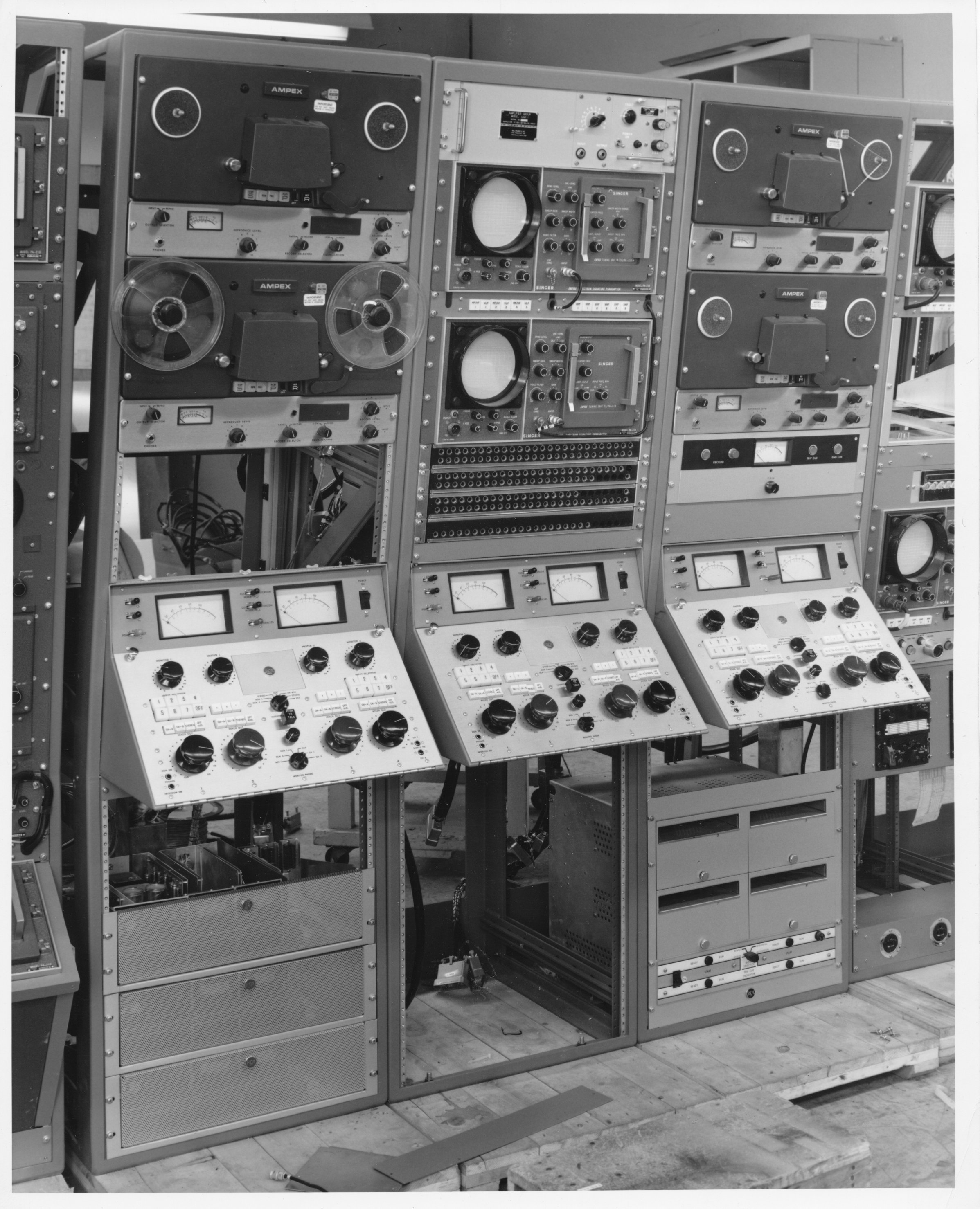 These two photos show Units 13A,B,C with audio tapes installed.  One view is aft, one for'ard, but I'm not sure which. This interior photo shows a pair of huge video tape players.  This photo shows a couple of film-to-video systems.  These units are just barely visible behind the VTR's in the photo to the left.
