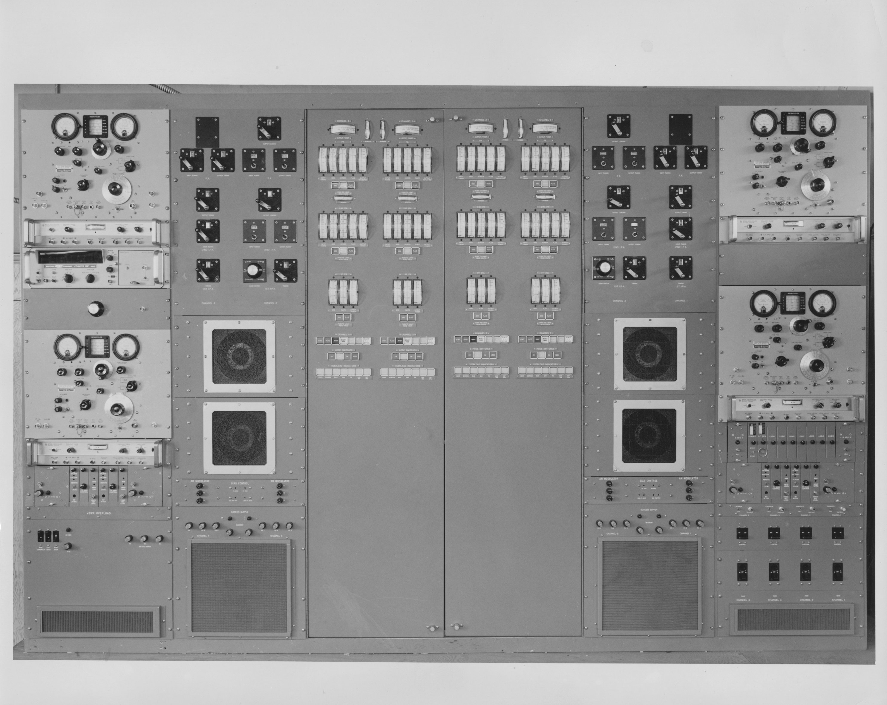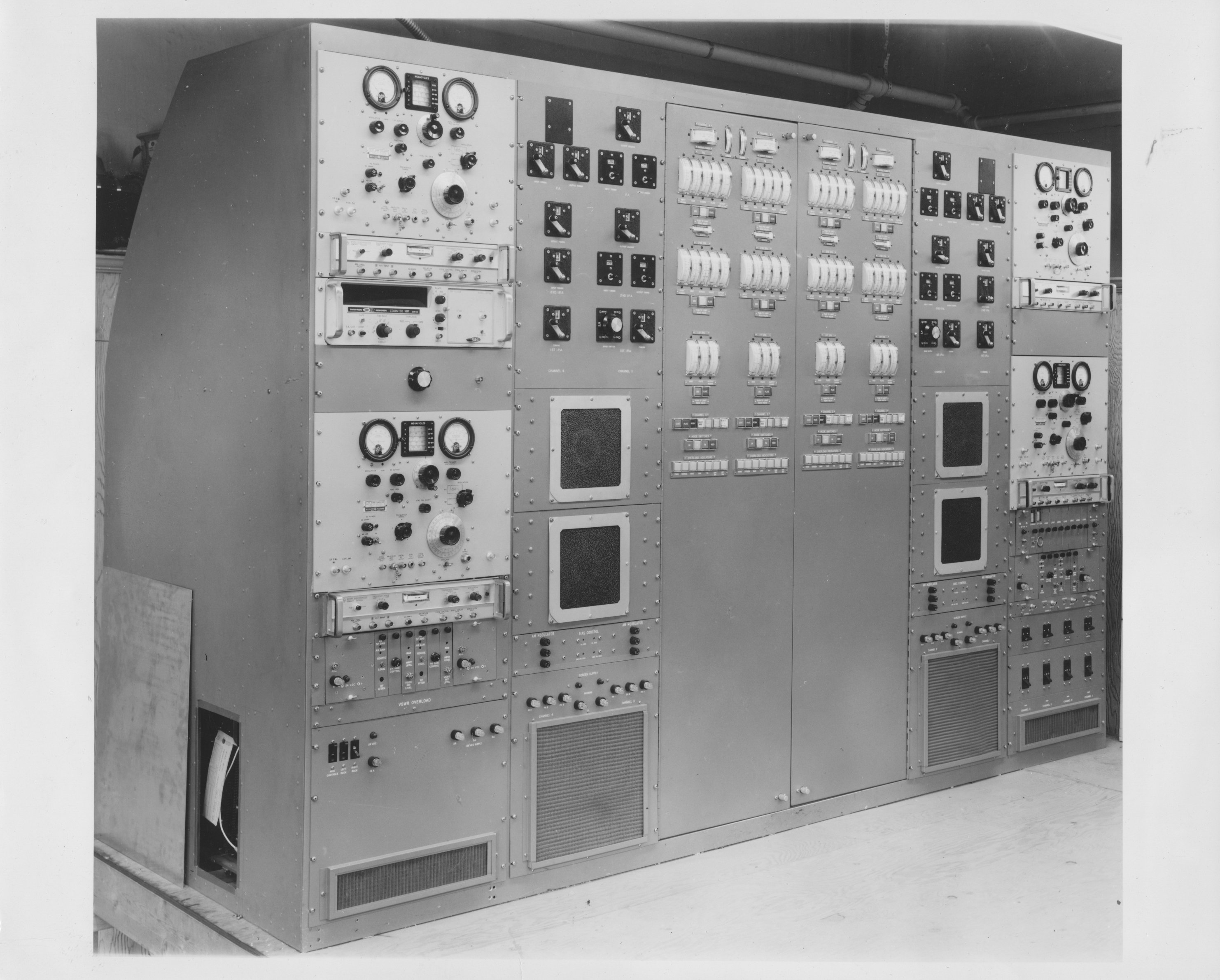 6811.5-1 TMC SPT-3KVHF Transmitter.  This unit provided CW, AM, FM, and television transmission between 30 and 350 Mc.  Evidently, it could provide 4 simultaneous 2KW outputs in pairs on two bands.  This transmitter was designed and built by Multronics, Inc, under contract to TMC. No photo number, but clearly the SPT-3KVHF shown  in 6811.5-1 while under construction. 6811.5-2.  Overall view of SPT-3KVHF transmitter. 687.5-5  View behind one of the two switching panels of the SPB-3KVHF.